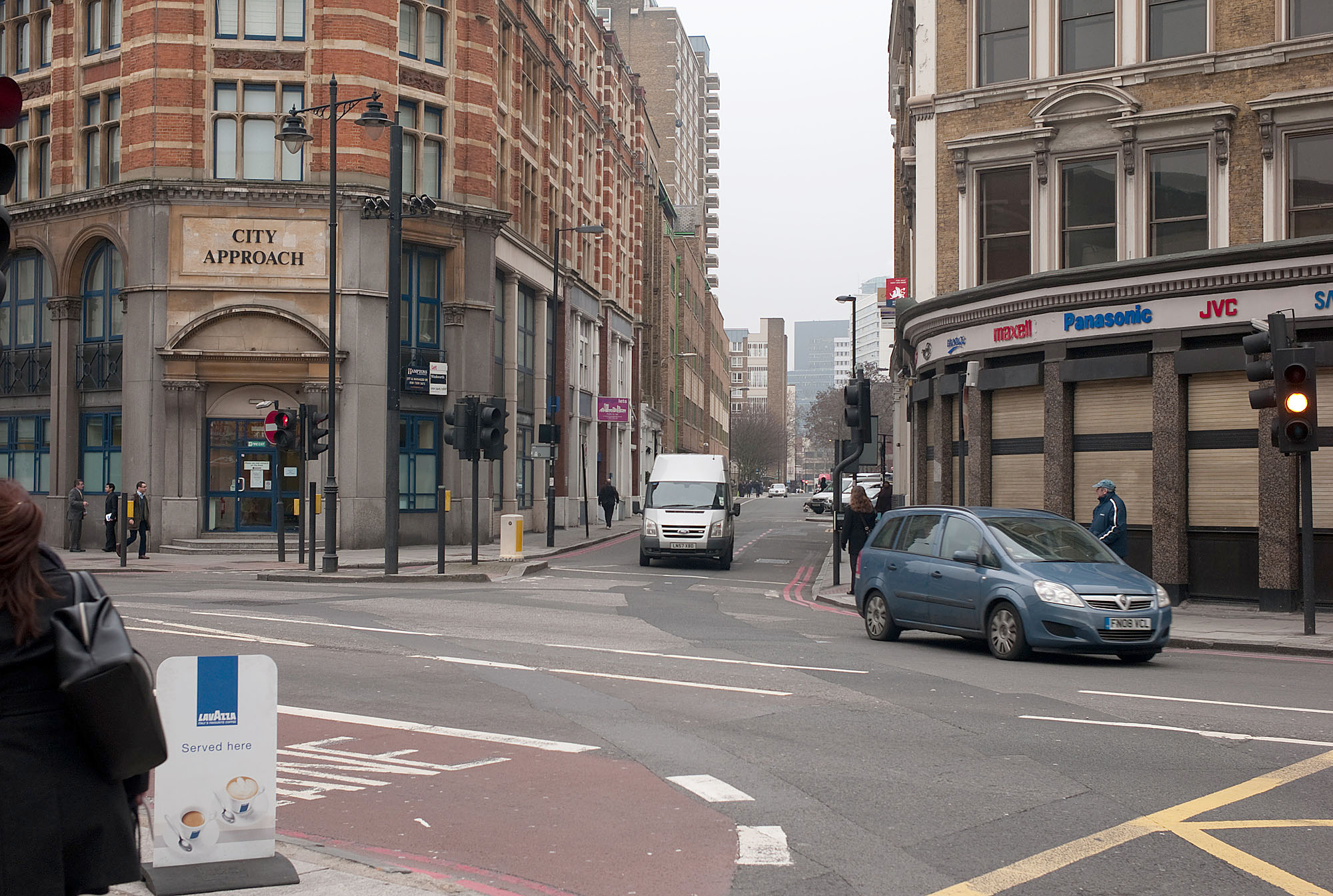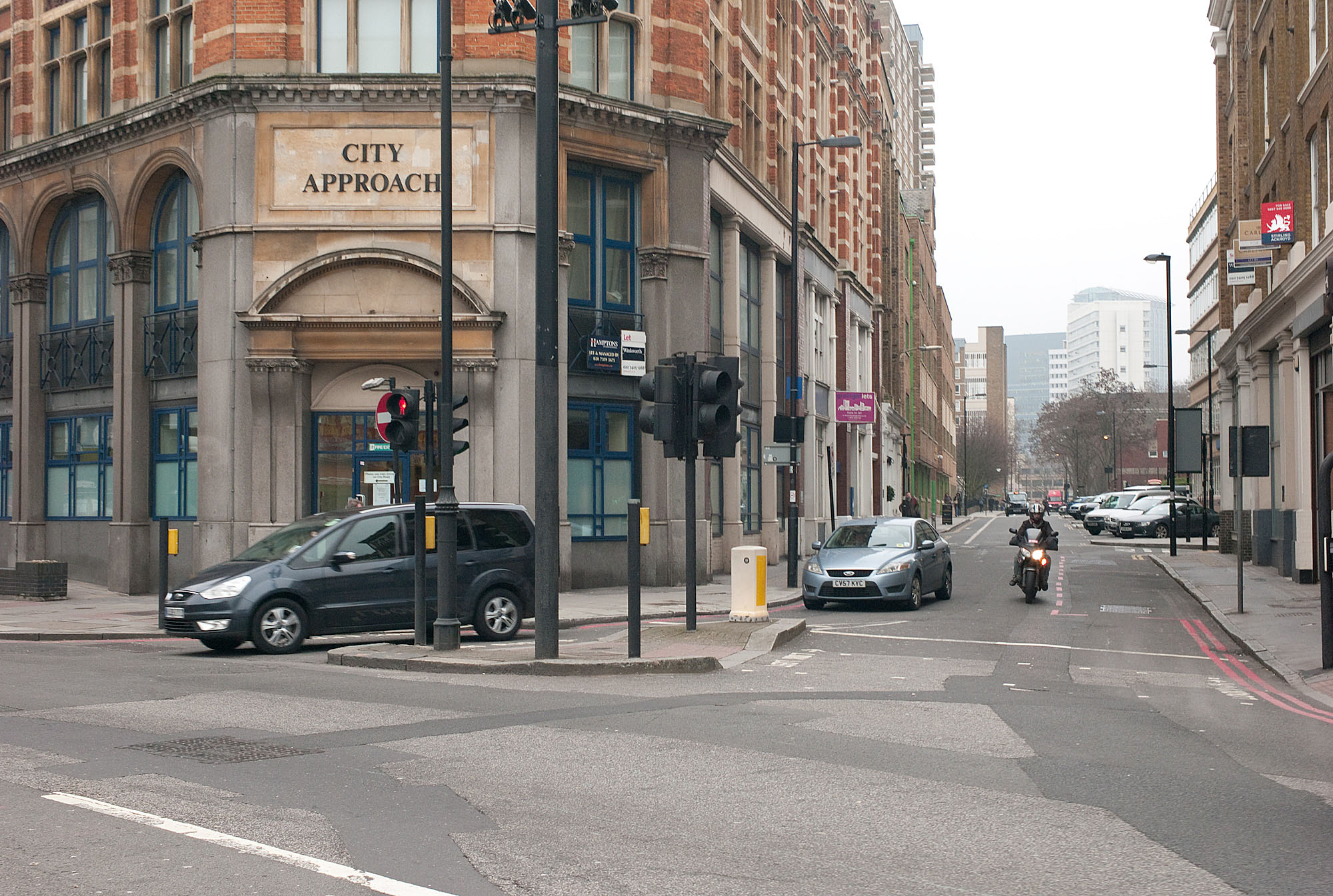 The junction Bath Street / City Road seen from the opposite side of City road. The right turn lane for the cars is the issue.
