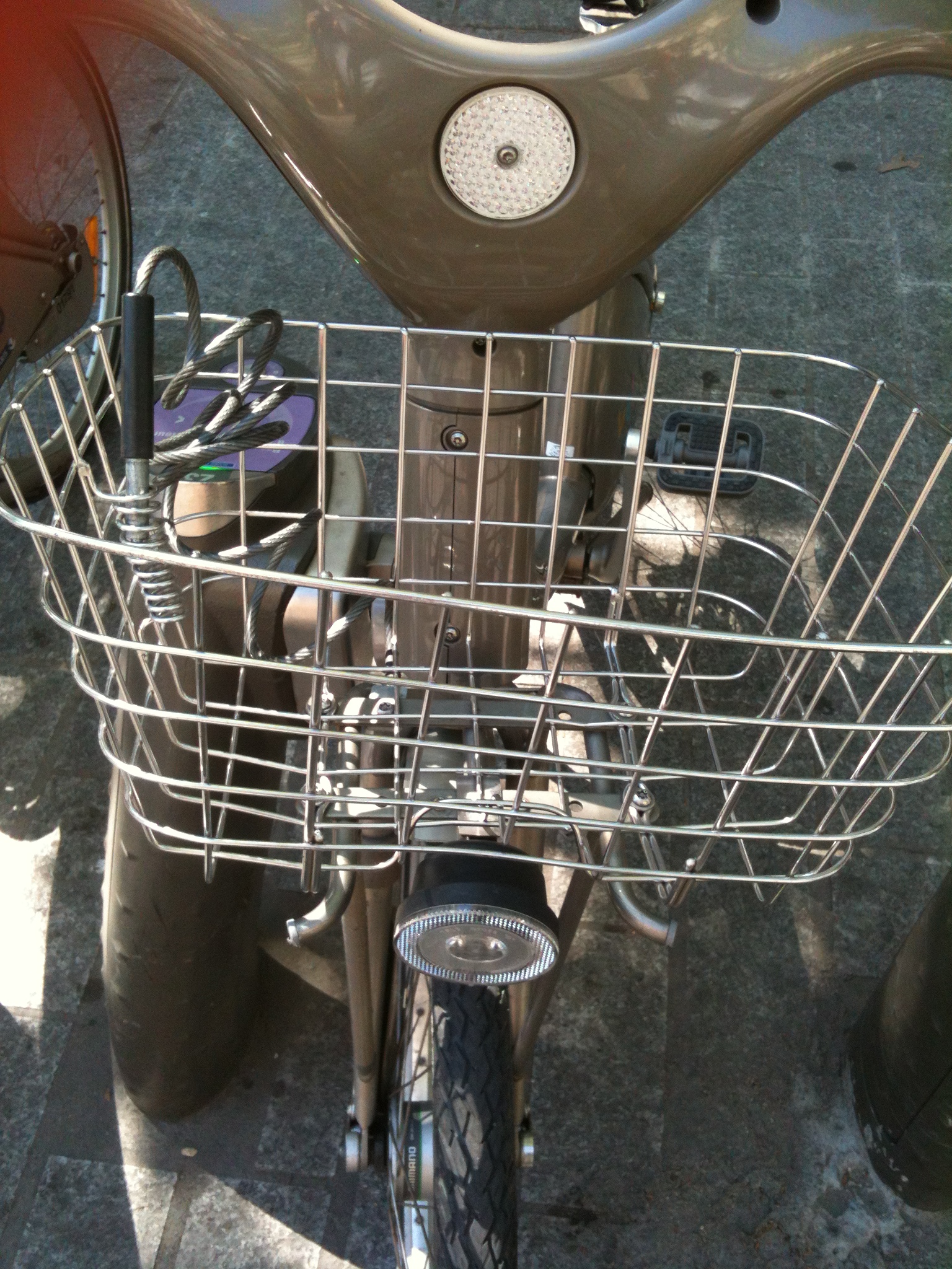 The front basket of a Velib. On the left hand side, you can see the built in cable lock. (my own photo)