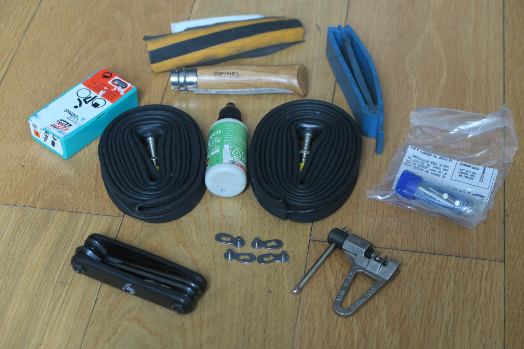 As a pump, I’ll take the Top Peak Race Rocket, which only weights 90 grams (not pictured). A multi tool, an Opinel pocket knife (also for making sandwiches), a chain tool plus some chain links and an emergency spoke come on top.