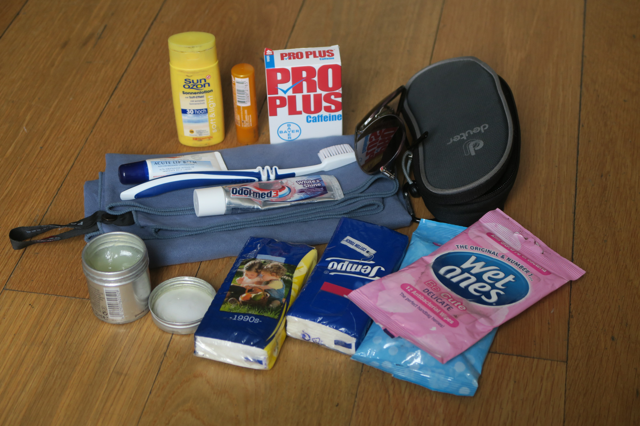 All in all, this stuff adds up to 500 grams. The ususal stuff: Toothbrush, tooth paste and shampoo, sun scream, Hidrofugal anti-perspirant. Vaseline for my bum.