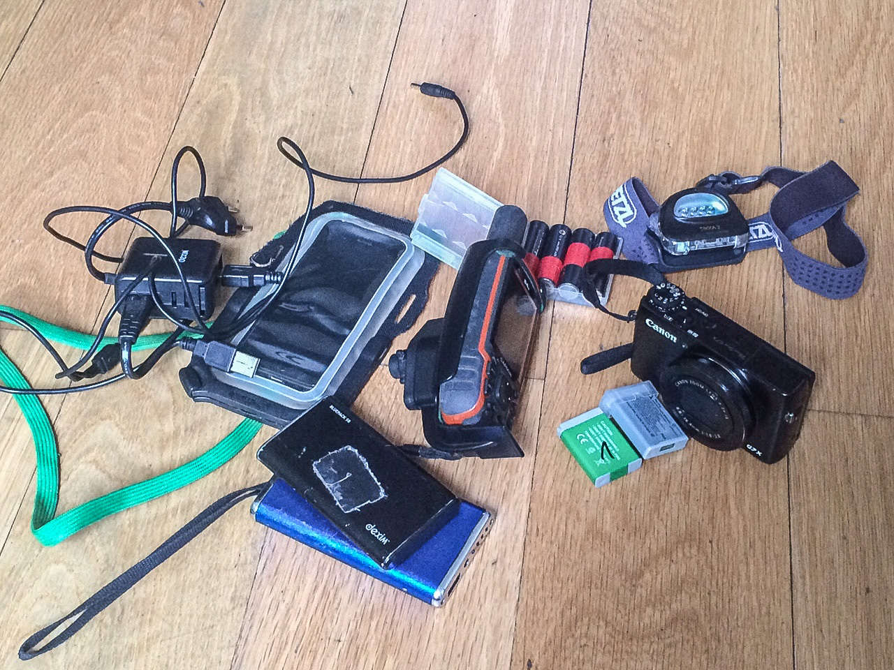 In terms of weight, that’s the second biggest component at 1.5 kilos. The iPhone plus charger and backup battery pack add up to 400 grams. The camera – a Canon G7X, which is absolutely fantastic – plus two spare batteries is at 350 grams.