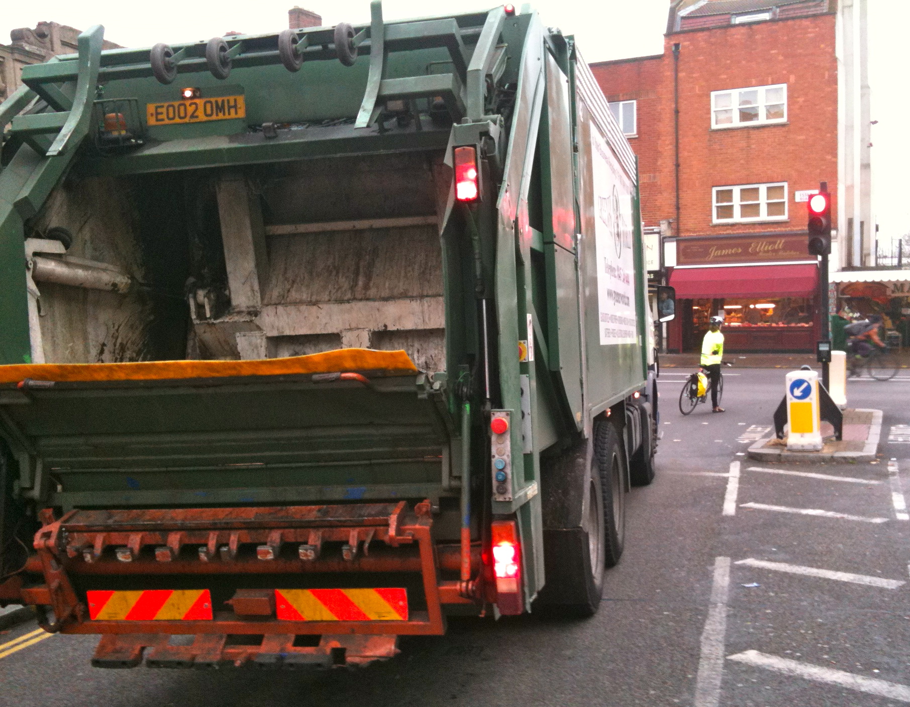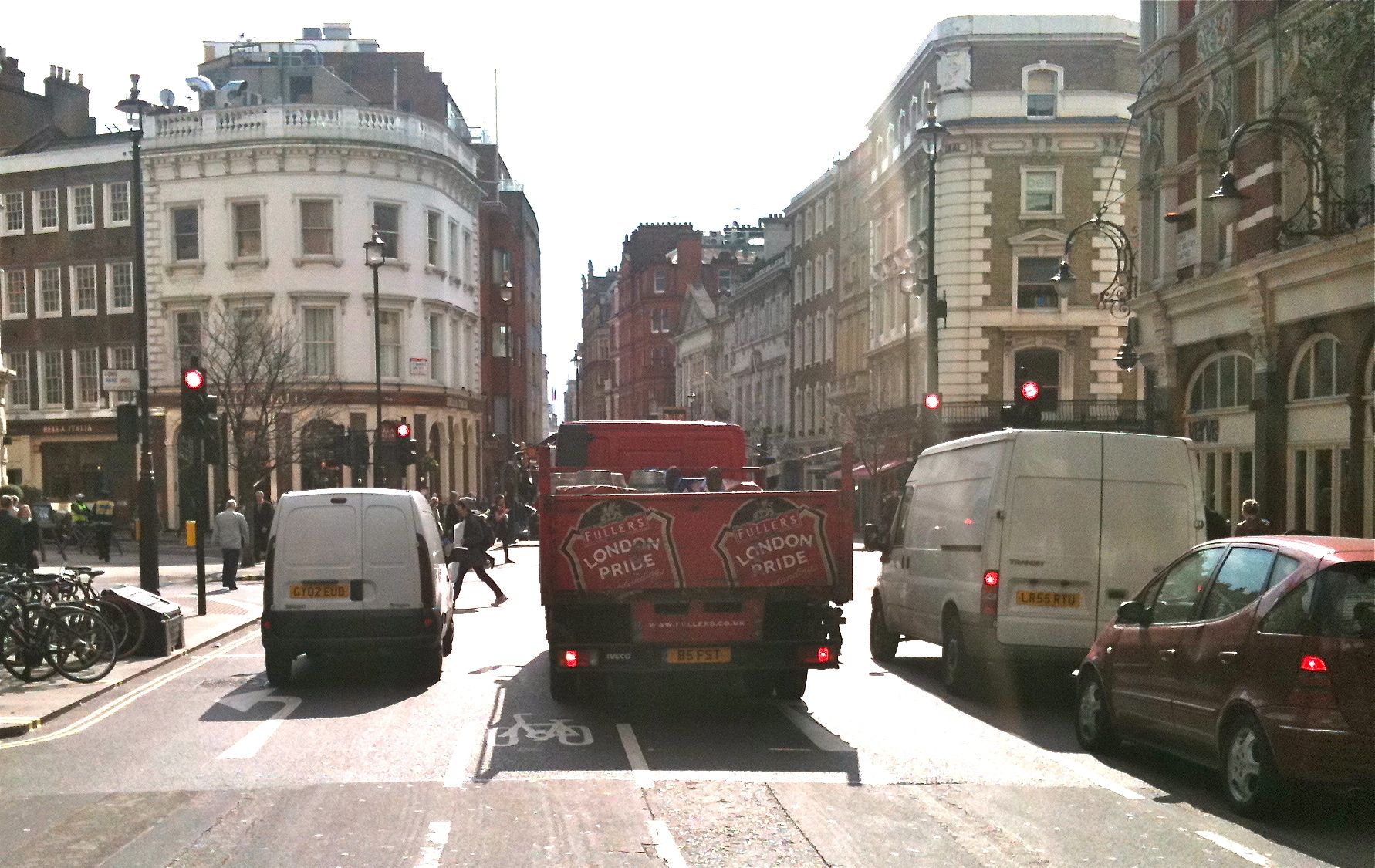 This is an example of a harmless looking situation that could easily have come dangerous. I was cycling southbound on Upper St. Martin’s Lane in Covent Garden and approached this lorry at the junction of Long Acre and wanted to cycle straight on. The lorry was waiting in the lane for straight on traffic and was not indicating. However, when the lights turned green, it made a left turn anyway. If I would have passed the lorry on the left side trying to get in front of the vehicle and the lights would have changed in that moment, I would have been in trouble. However, I just waited behind the lorry.