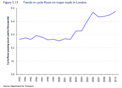 The big spike in cycling in London happened between 2002 and 2005, as this chart confirms. Ever since, cycling seems to have reached a new plateau.
