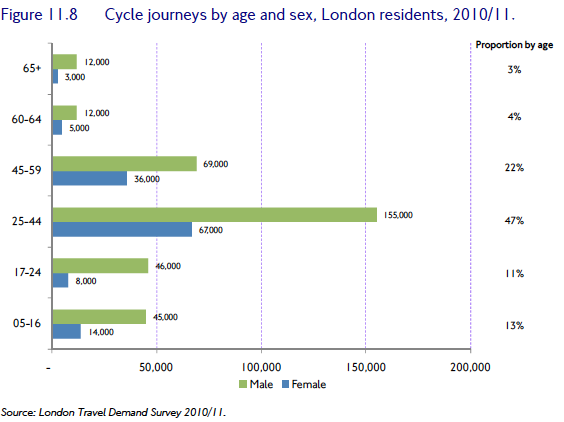 According to the latest figures in the “Travel in London 4” report that was published in January, the typical cyclist in London is male.